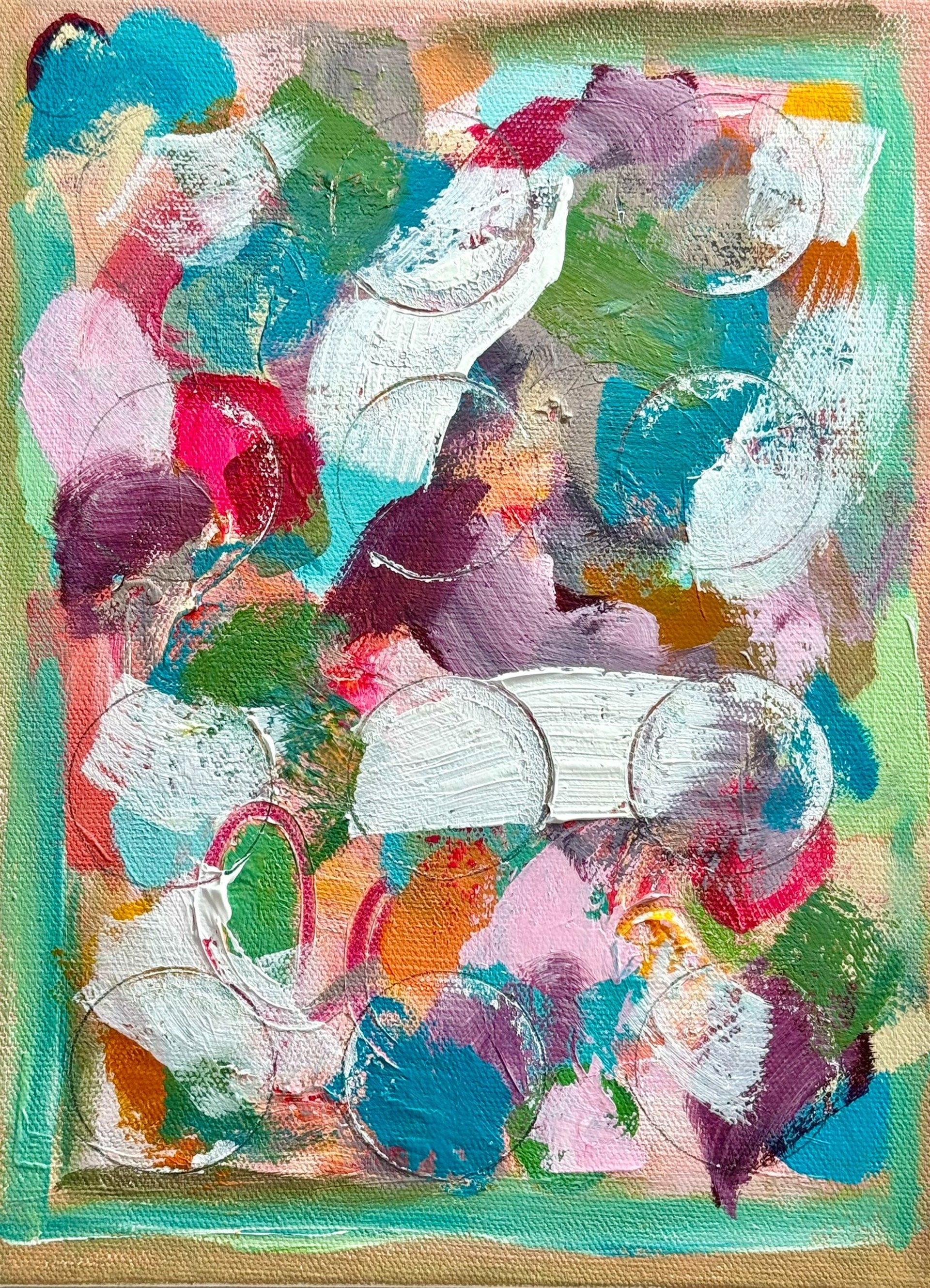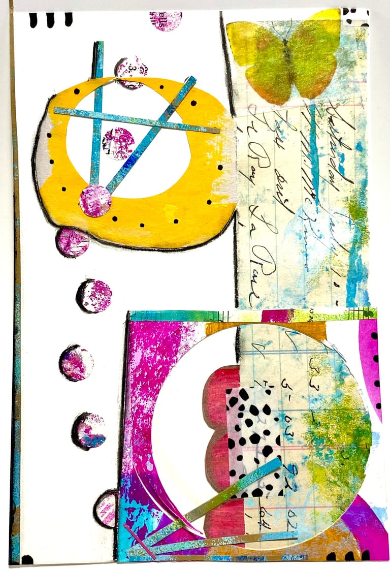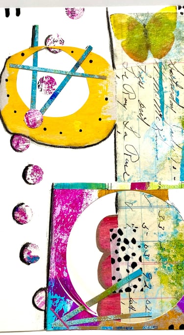 Create abstract mixed-media collage art with an optional ‘found word’ micro-story.
